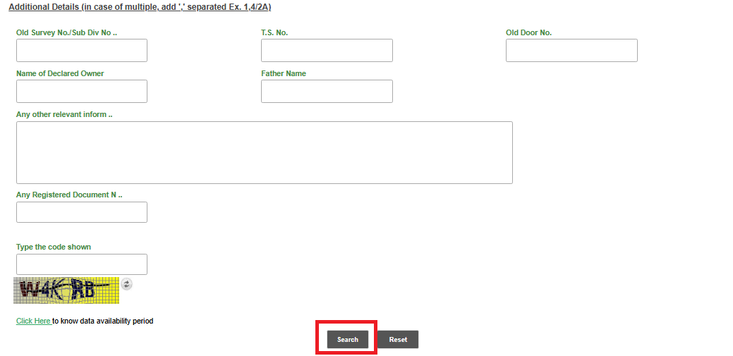 - Additional: Old survey number, declared owner, any known document numbers. Solve the CAPTCHA and click "Search" to preview related records.